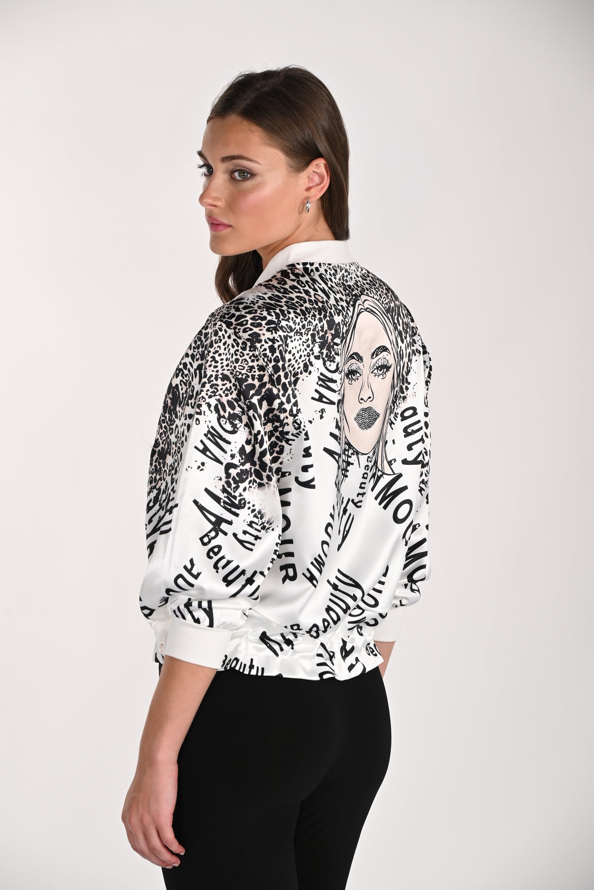 A statement piece with modern edge, this printed blouse blends bold artistry with everyday versatility. Featuring an eye-catching mix of graphic lettering and abstract portrait detailing, it brings a unique, fashion-forward feel to any outfit. The relaxed silhouette, soft drape, and elasticized hem create a flattering shape while ensuring all-day comfort. Finished with a subtle neckline and easy sleeves, it pairs effortlessly with tailored pants or denim for a polished yet expressive look.