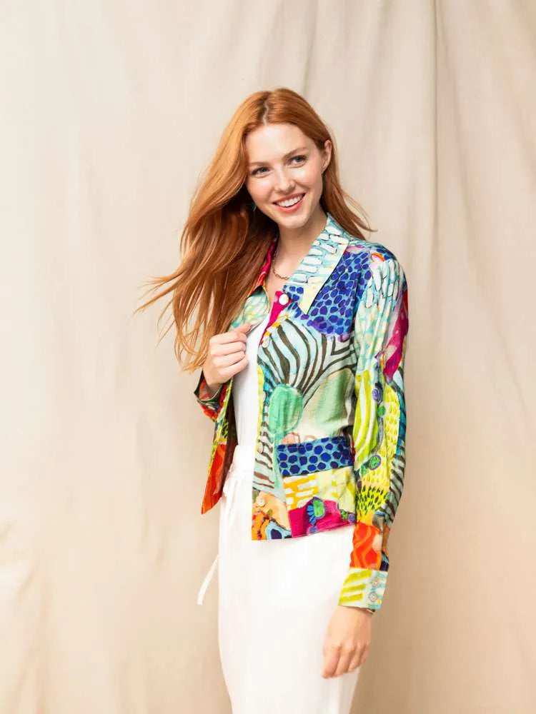 This lightweight jacket features a vibrant artistic print inspired by nature. Designed with a classic collar, button front, and front pockets, it’s an easy layering piece that adds color and style to any outfit. Part of the Morning Hike Collection.