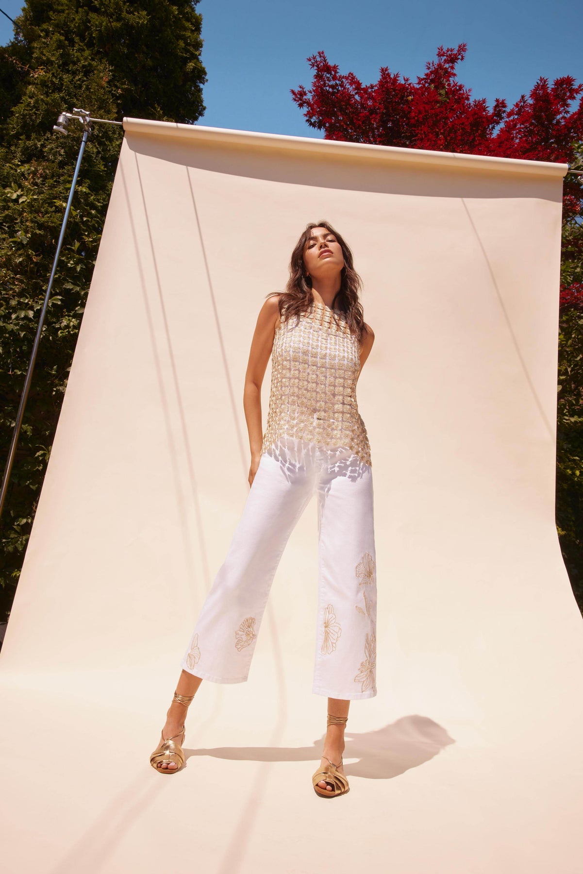 Floral Embroidered Cropped Flare Twill Pants Charlie B