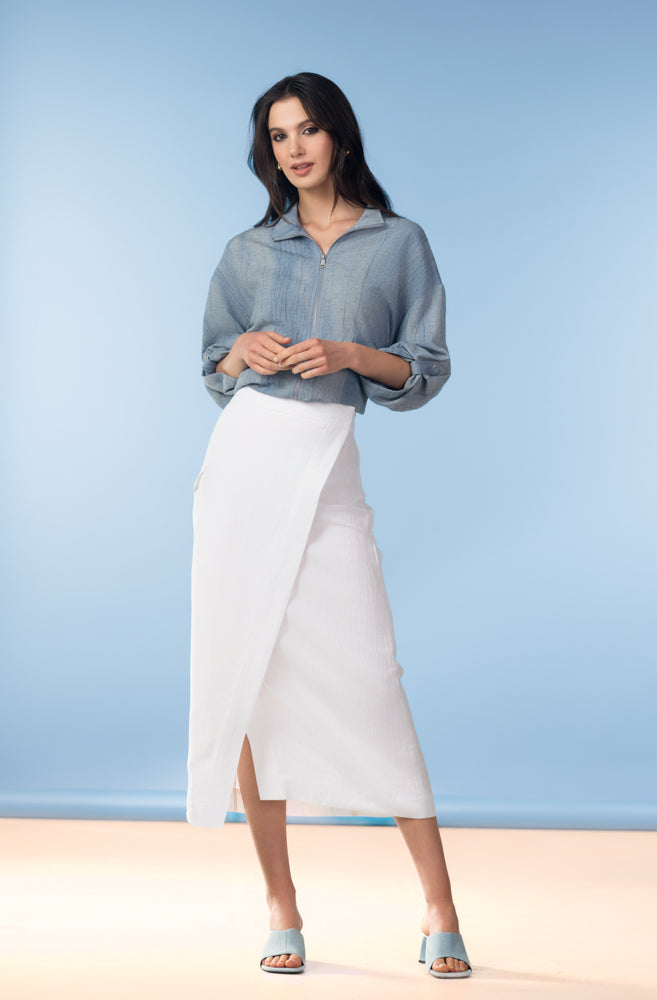 This wrap midi skirt combines sophisticated simplicity with timeless appeal. The high-rise design flatters your figure while the wrap-front styling adds contemporary flair and graceful movement. Perfect for creating polished, versatile looks that transition seamlessly from office to evening, this essential piece delivers understated luxury with every wear.