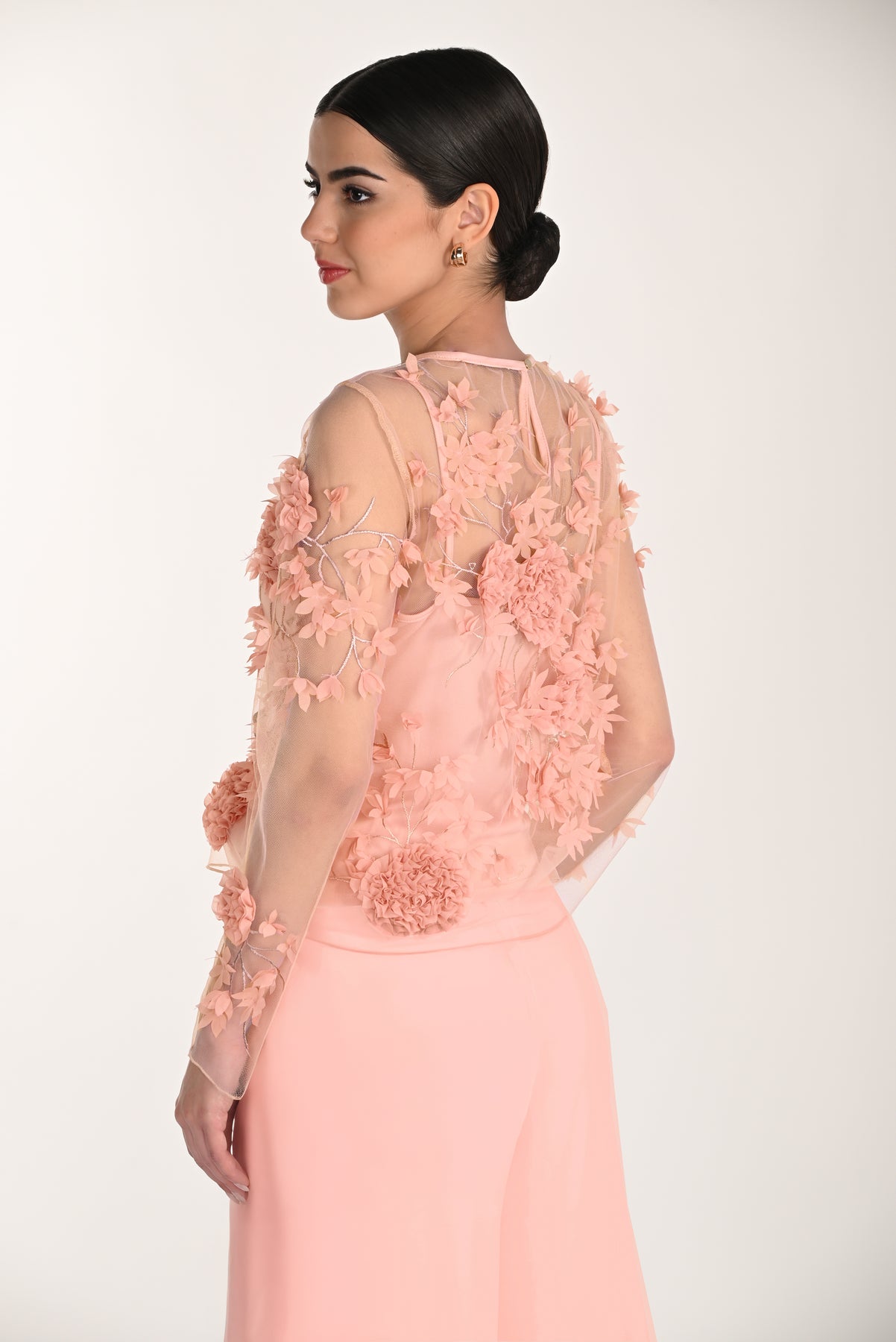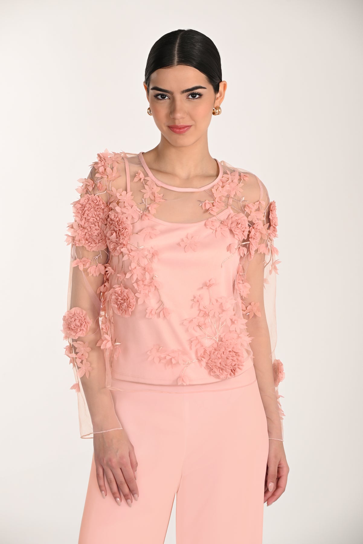 Romantic and delicately detailed, this sheer overlay top is adorned with intricate 3D floral appliqués that create a soft, textured look. Designed with a lightweight mesh layer over a smooth inner lining, it offers both coverage and elegance. The relaxed silhouette and airy sleeves enhance its feminine charm, while the floral accents add dimension and visual interest. Perfect for special occasions or elevated everyday wear, it pairs beautifully with tailored pants or skirts for a refined finish.