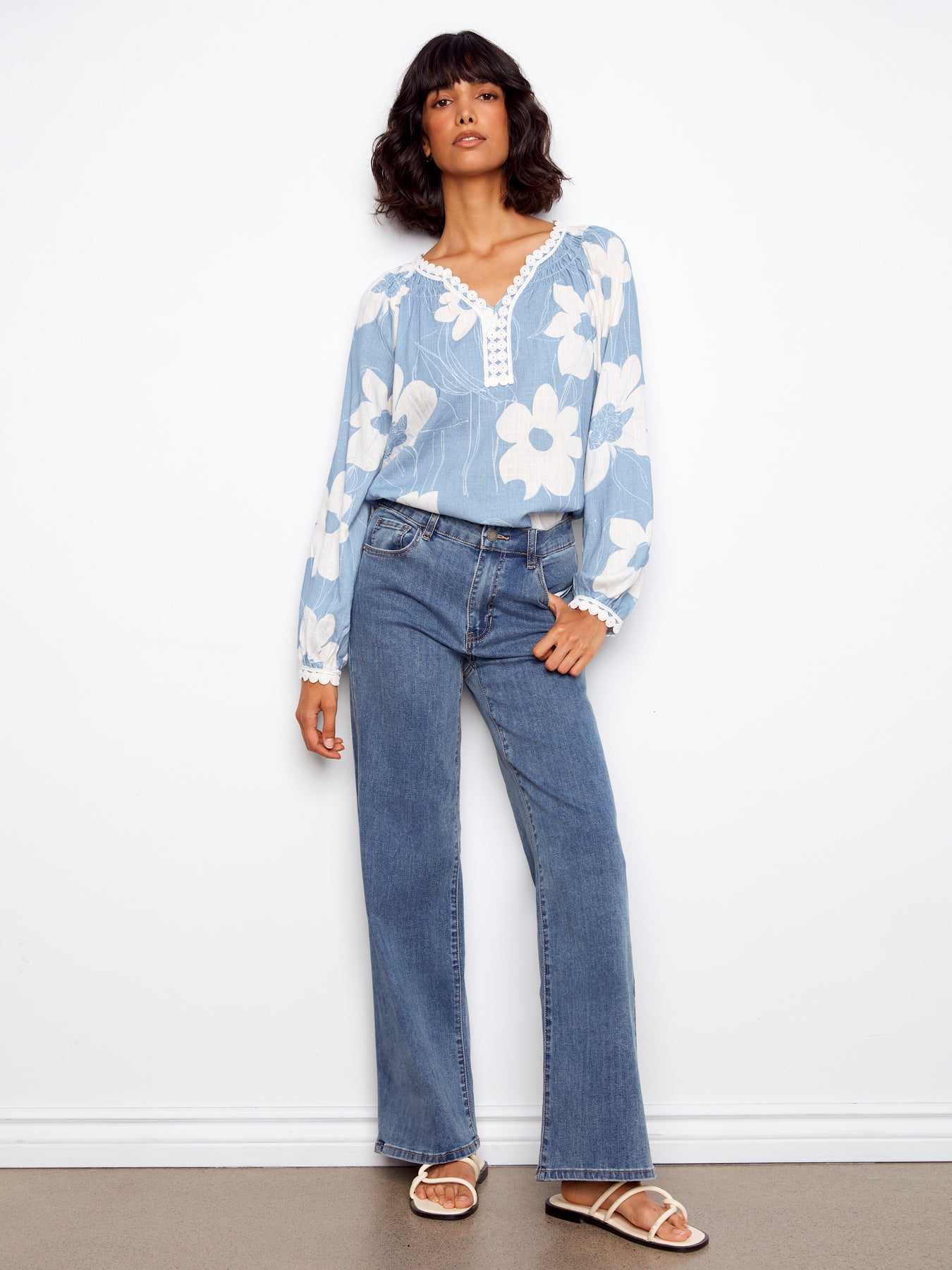 This breezy blouse captures an easy, bohemian-inspired feel with its soft floral print and relaxed shape. The lightweight fabric drapes effortlessly, making it a comfortable and stylish choice for everyday wear. A split V-neckline with delicate trim detailing adds a feminine touch while keeping the look laid-back.