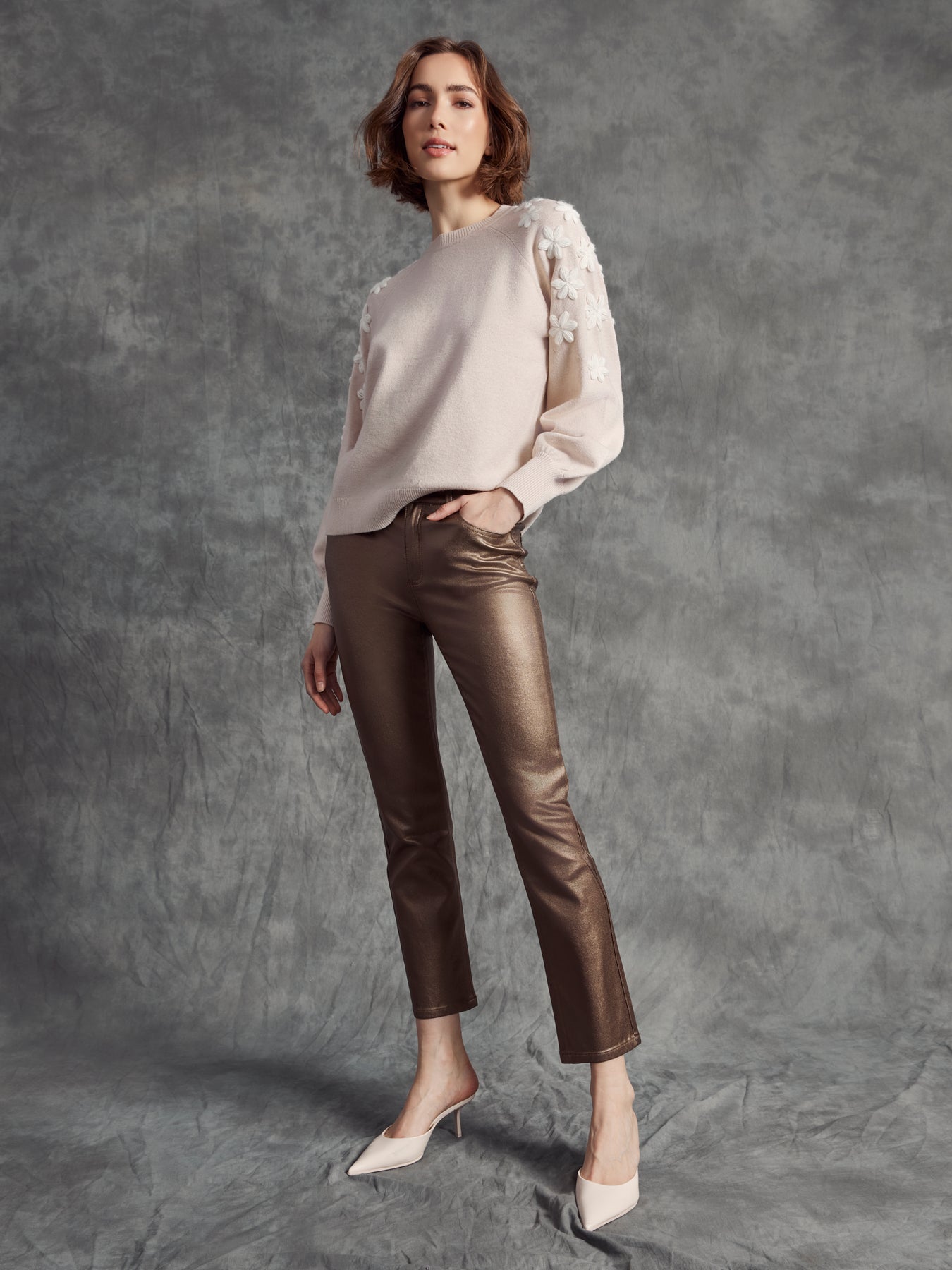 This crew neck sweater combines classic comfort with delicate feminine details. Featuring raglan puff sleeves, it adds a subtle, flattering volume to your silhouette. Intricate embroidered flowers adorn the shoulder, bringing a touch of elegance and artistry to your everyday look. Made from soft, cozy fabric, this sweater is perfect for layering or wearing on its own, keeping you both stylish and comfortable throughout the day. Elevate your wardrobe with this charming piece that effortlessly blends timeless design with unique embroidered accents.