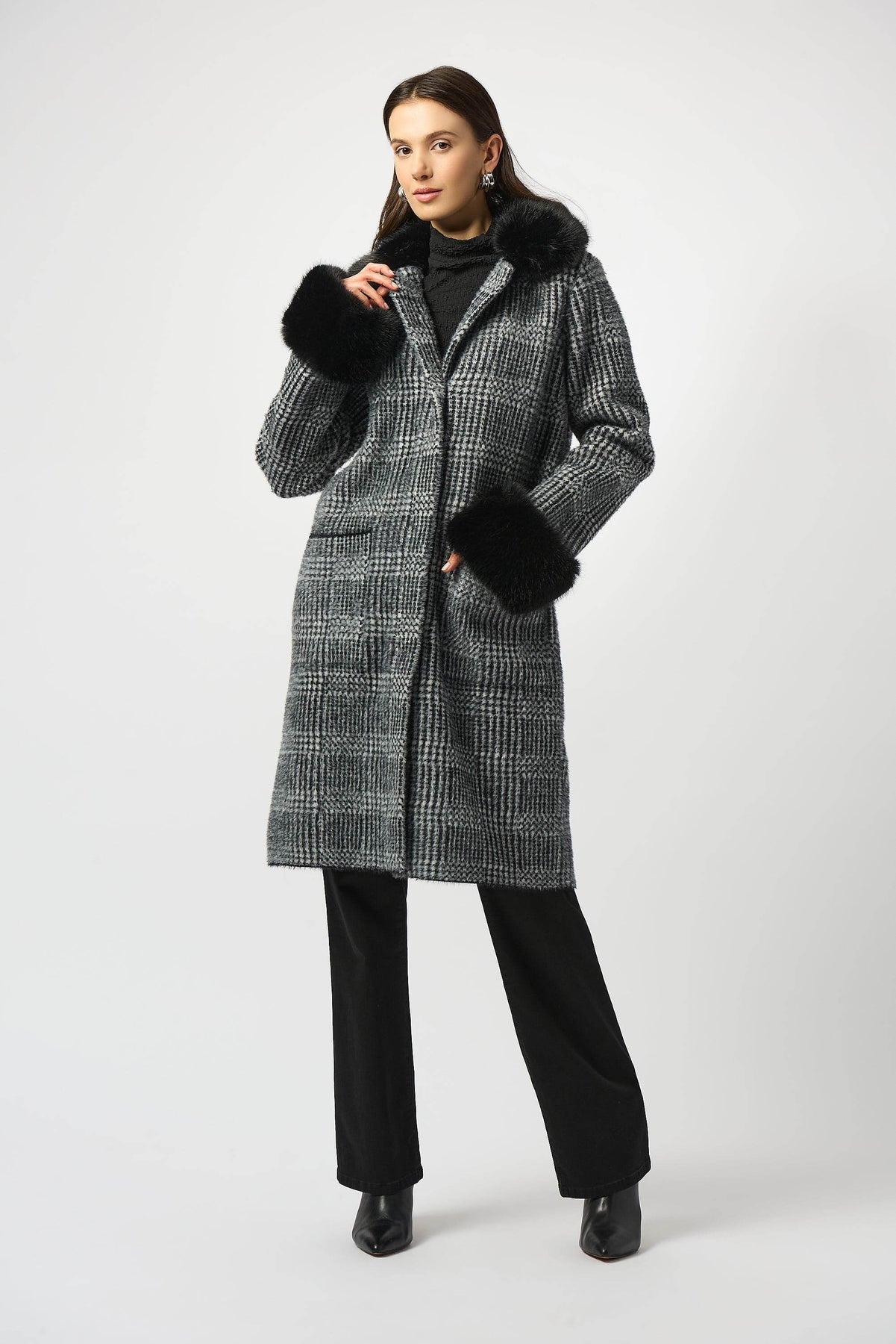 This classic plaid coat is elevated with plush faux fur accents on the collar and cuffs, bringing refined style to a timeless look. Made from soft feather yarn sweater knit, it offers warmth and comfort with a notched collar, contrasting-trim front pockets, and a sleek straight fit. Ideal for staying chic and cozy during colder months.