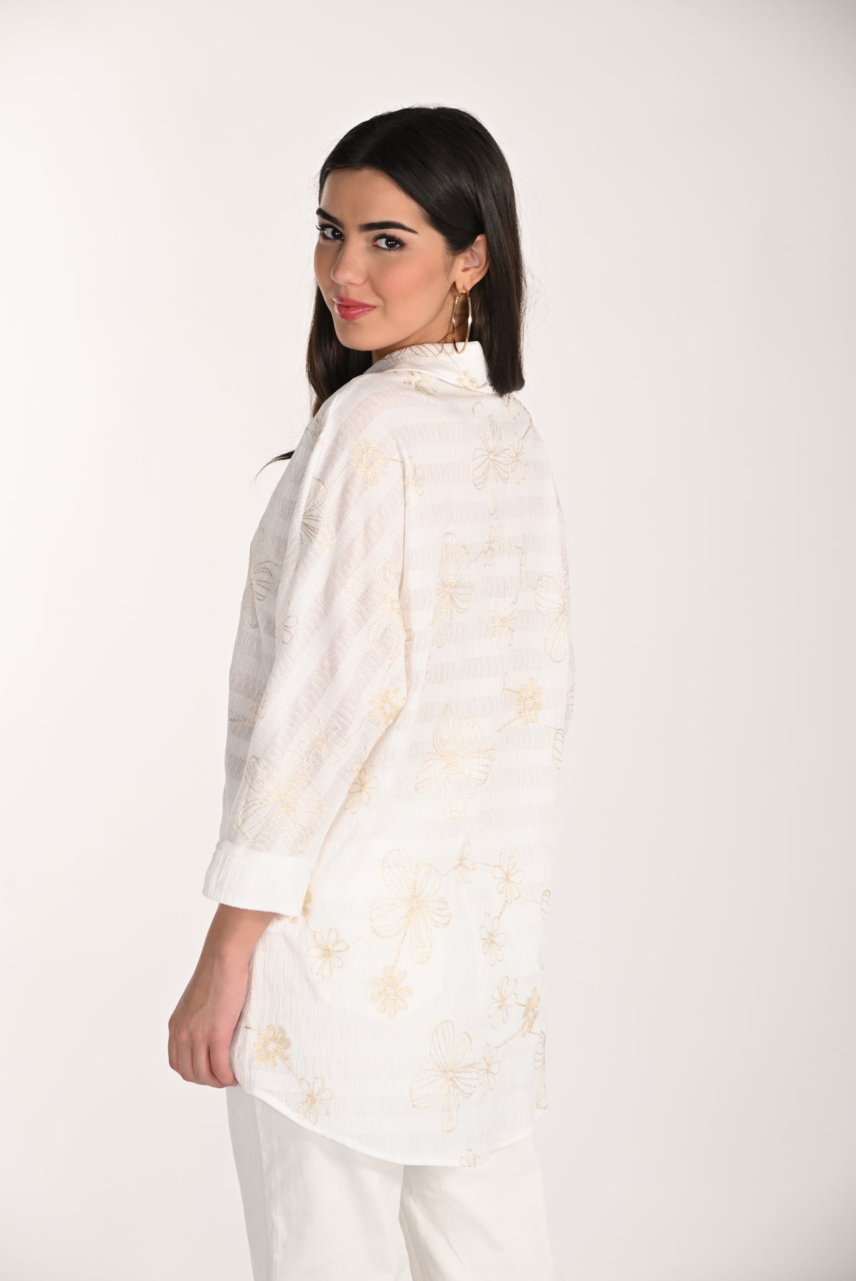 Elegant and versatile, this floral woven blouse combines delicate gold embroidery with soft striping for understated sophistication. The classic collar, button front, and three-quarter sleeves create a polished silhouette that transitions seamlessly from day to night. Lightweight and beautifully textured, it's the perfect piece to elevate any wardrobe with timeless style.