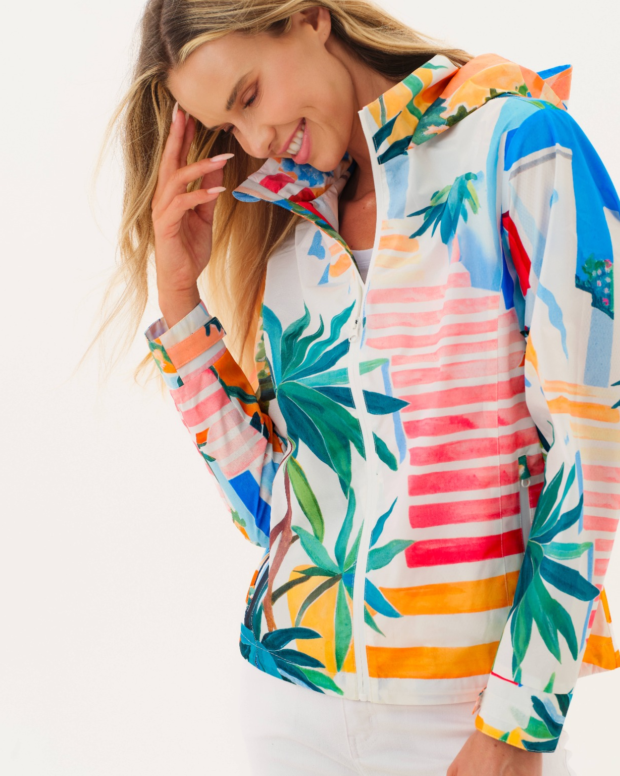 This lightweight raincoat features a vibrant, art-inspired print that blends tropical leaves with soft stripes for a fresh, modern look. Designed with a stand collar, long sleeves, and a front zip closure, it offers practical coverage with a polished feel. The water-resistant fabric and easy, flattering fit make it perfect for layering on rainy days while keeping your style effortlessly