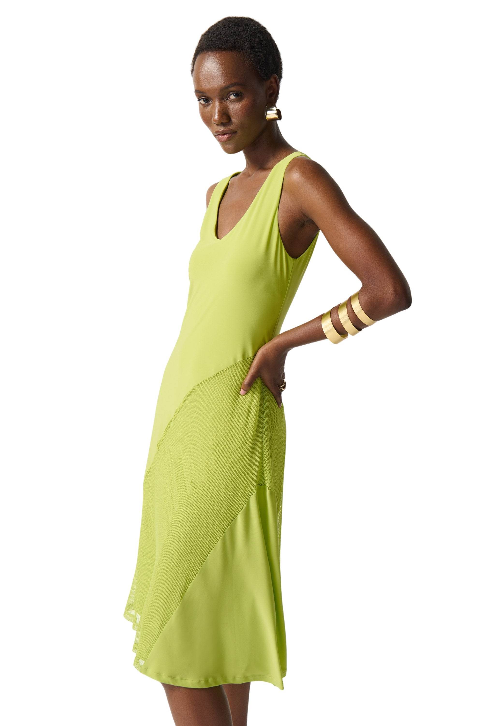 Let us unveil this chic sleeveless dress featuring solid silky knit and knit mesh. With diagonal cuts and an A-line silhouette, it embraces your style with flair. The V-neckline and asymmetrical hem add a touch of allure. Lined for comfort, this dress is a must-have for your fashion-forward collection.