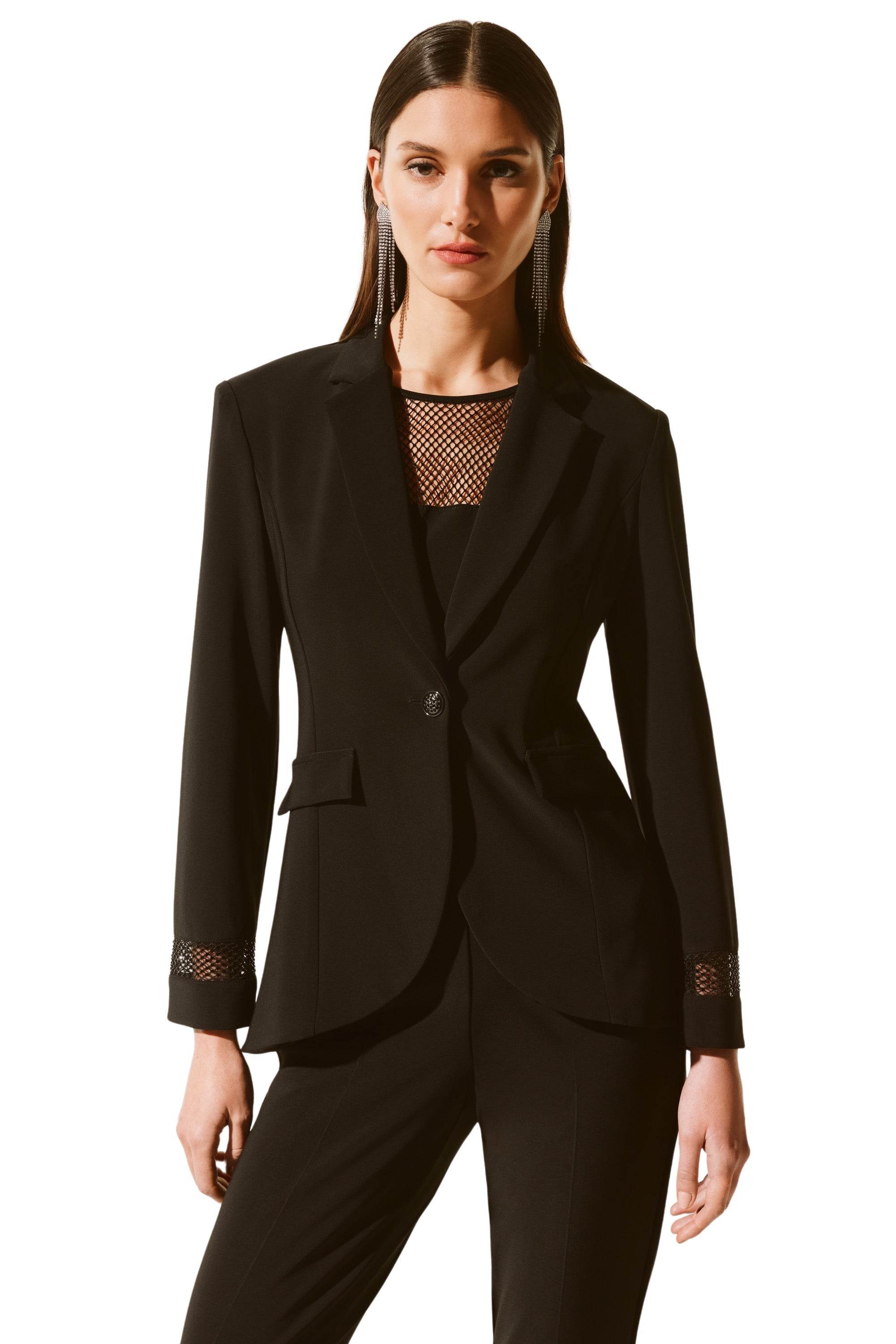 Elevate your look with our Signature silky knit blazer, complete with shimmering mesh accents at the cuffs and a sparkling rhinestone button closure. This elegant and sophisticated piece is perfect for special events or a luxurious dinner out. For a truly stunning ensemble, pair it with our Signature matching pants. Part of our exclusive Signature collection.