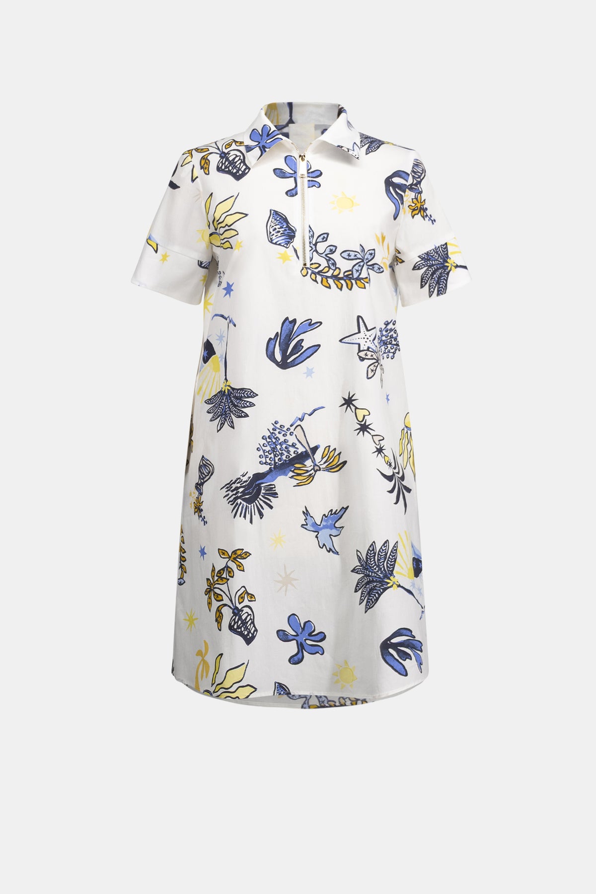 This stretch cotton A-line dress features a tropical print with a shirt collar and front metal zipper for a modern touch. Short cuffed sleeves and side pockets add ease to its knee-length silhouette.