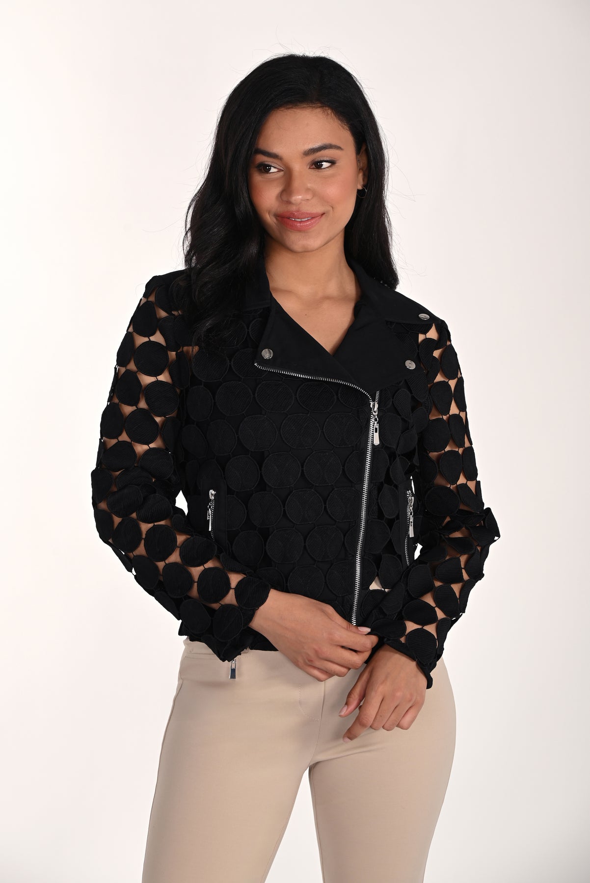 Make a powerful style statement with the Urban Halo Jacket, where contemporary design meets everyday versatility. This piece commands attention through its innovative 3D circular overlay that creates striking visual depth, while a sleek, structured silhouette keeps the look refined and wearable. The asymmetrical front zipper and polished silver hardware deliver moto-inspired edge, complemented by functional zip pockets and a tailored waist that flatters your frame. Whether you're layering it over minimalist basics or pairing it with fitted trousers, this jacket elevates your wardrobe with undeniable sophistication and modern attitude.