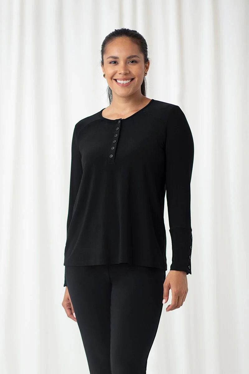 The Sympli Diva Henley is an essential piece of any fashion enthusiast's closet. This classic henley top boasts long sleeves, a rounded neckline, and six buttons, making it a perfect choice for everyday wear.