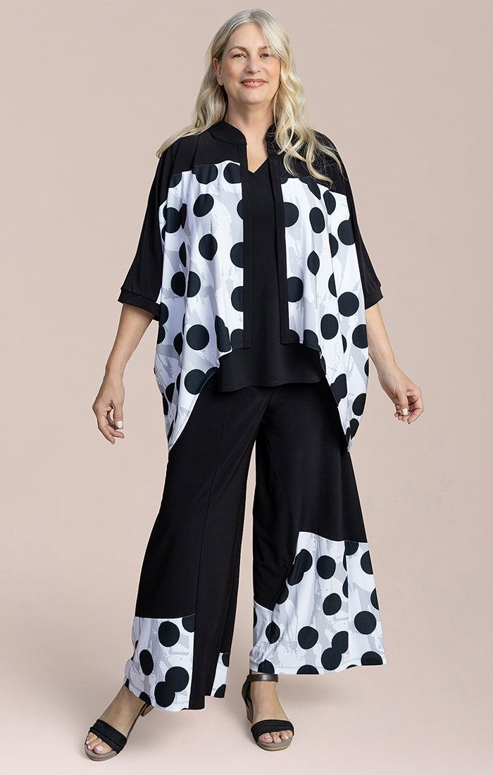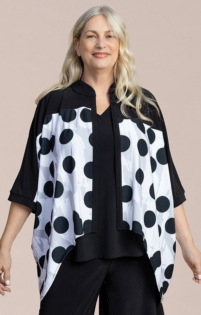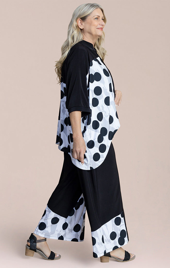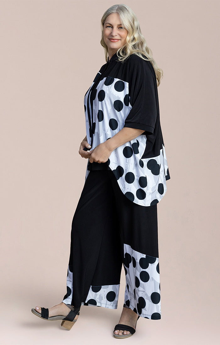 This relaxed-fit top blends comfort with modern style. Designed with a flowy silhouette, it drapes beautifully for an easy, flattering fit. The front button detail and contrast trim add structure, while the bold abstract print creates a contemporary statement. Lightweight and breathable, it layers effortlessly over a tank or cami and pairs perfectly with wide-leg pants or slim bottoms. A versatile piece that transitions seamlessly from day to evening.