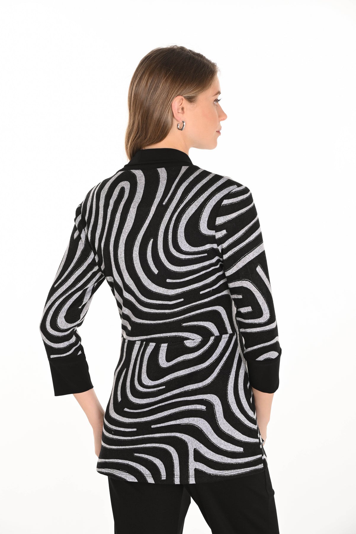 Découvrez le cardigan ouvert Frank Lyman, pièce essentielle et polyvalente qui vous accompagnera avec aisance du week-end au bureau. Ce modèle à la coupe classique et à la longueur hanches présente une encolure ronde sophistiquée et d'élégantes manches 3/4 ornées de détails raffinés, comme une découpe en forme de goutte. Ses motifs abstraits et rayés captivants le distinguent des cardigans ordinaires et vous assurent une allure remarquable, que ce soit pour une soirée en ville ou pour apporter une touche d'élégance à vos tenues du quotidien.