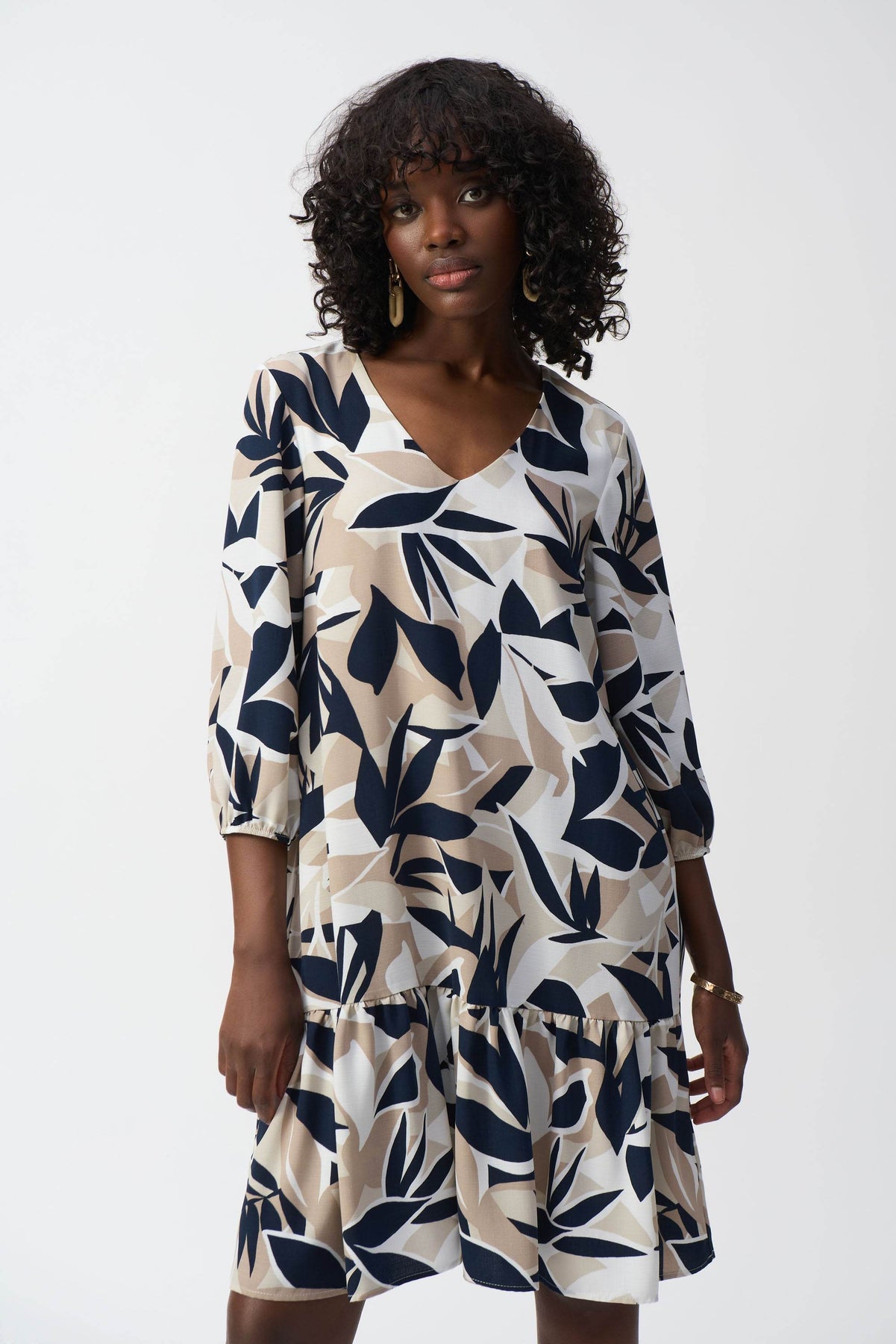 Affirmez votre style avec cette superbe robe à volants. Confectionnée en gaze douce, son imprimé tropical lui confère une allure fraîche et captivante. L'élégant décolleté en V et les manches bouffantes trois-quarts soulignent la coupe trapèze chic, mettant en valeur le design sophistiqué et tendance de la robe.