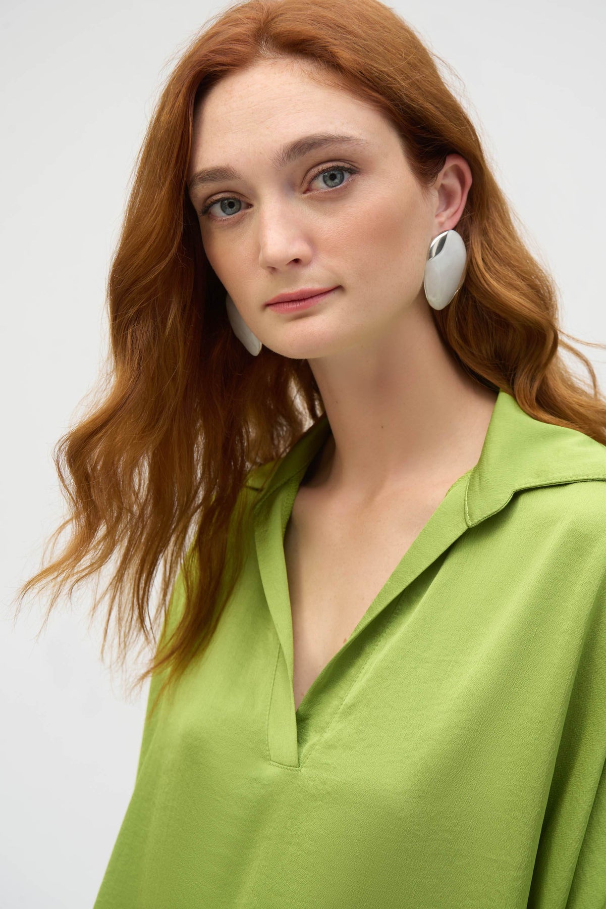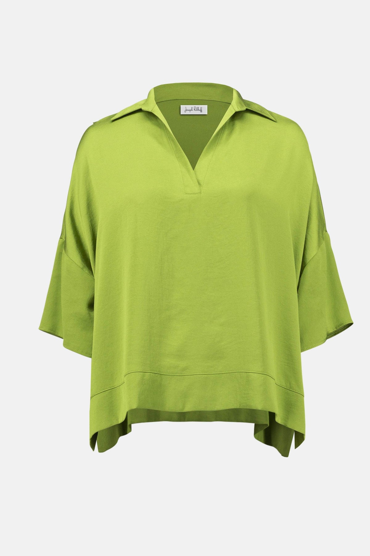 Sublimez votre style au quotidien avec ce top en satin, conçu pour une élégance naturelle. Son encolure en V, son col chemise classique et ses manches trois-quarts dolman lui confèrent une allure à la fois décontractée et raffinée. Sa coupe carrée, rehaussée de fentes latérales et d'un ourlet asymétrique, dessine une silhouette gracieuse, idéale pour composer une tenue remarquable.