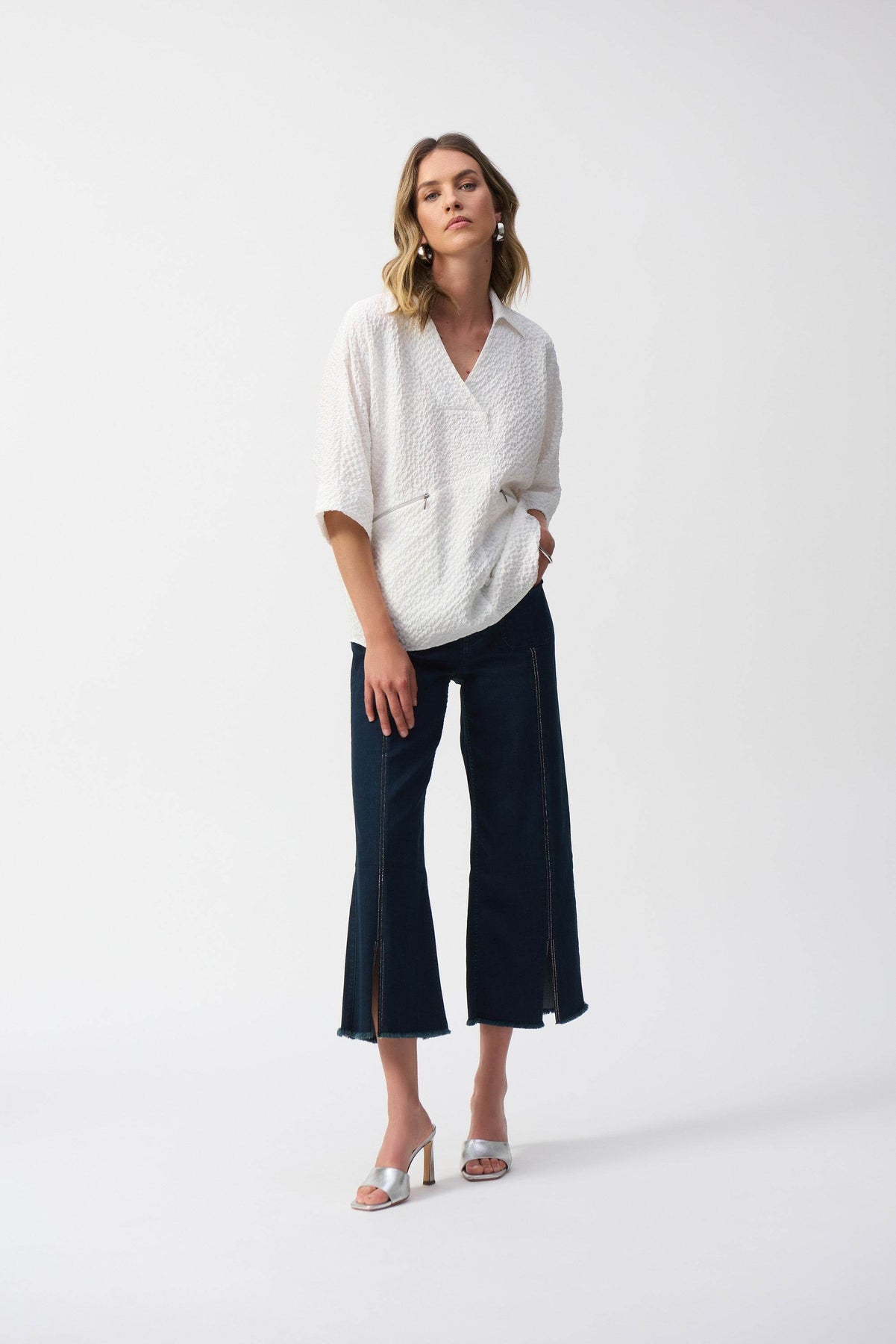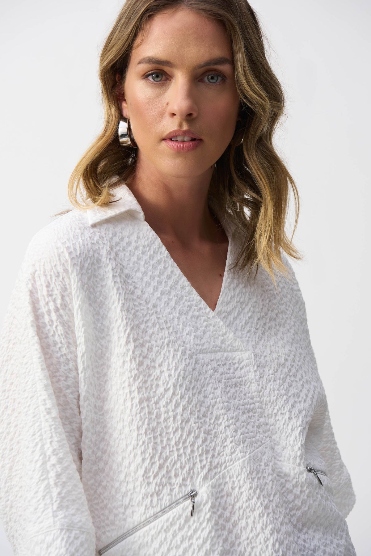 Ce top en seersucker présente un ourlet asymétrique tendance, gage d'un style moderne et décontracté. Son encolure en V, rehaussée d'un col chemise impeccable, apporte une touche sophistiquée à sa coupe carrée et ample. Les poches zippées sur le devant constituent un détail à la fois élégant et pratique, faisant de ce top une pièce indispensable de votre garde-robe quotidienne.