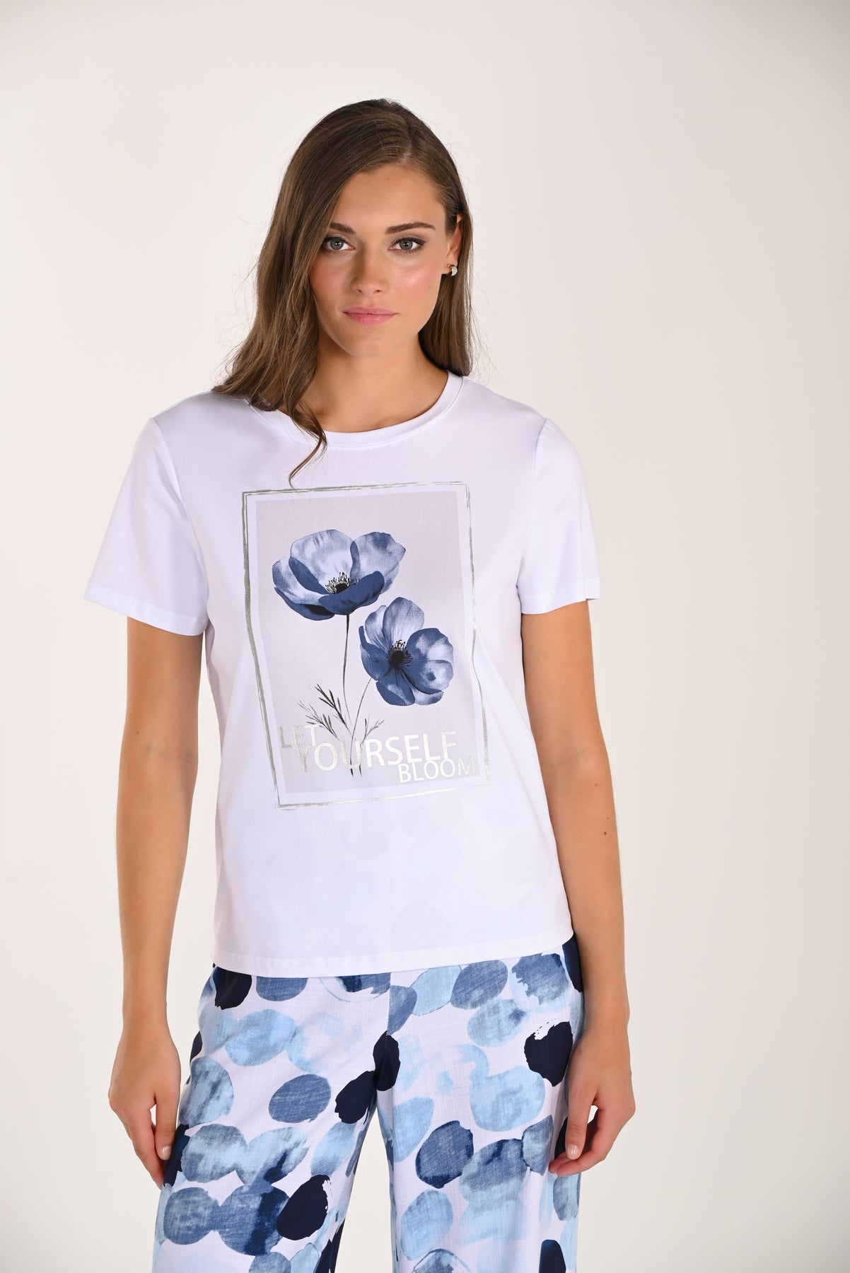 Fresh, feminine, and effortlessly wearable, this short-sleeve tee features a soft floral graphic with delicate blue blossoms and the inspiring “Let Yourself Bloom” message. Designed with a classic crew neckline and a relaxed silhouette, it offers a smooth, lightweight feel that drapes beautifully. Perfect for pairing with printed pants, denim, or layering under a jacket, this versatile top brings a touch of artistry and positivity to your everyday wardrobe.