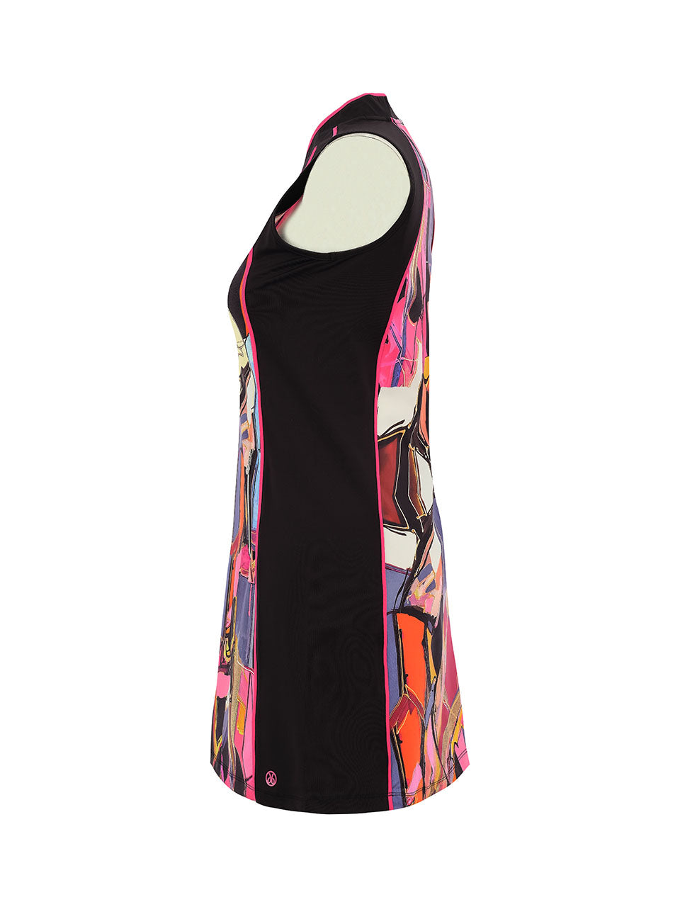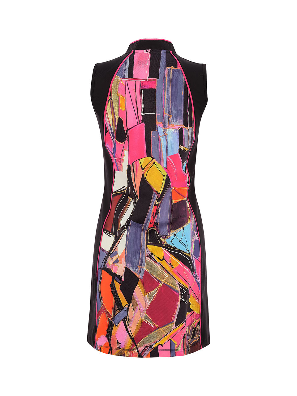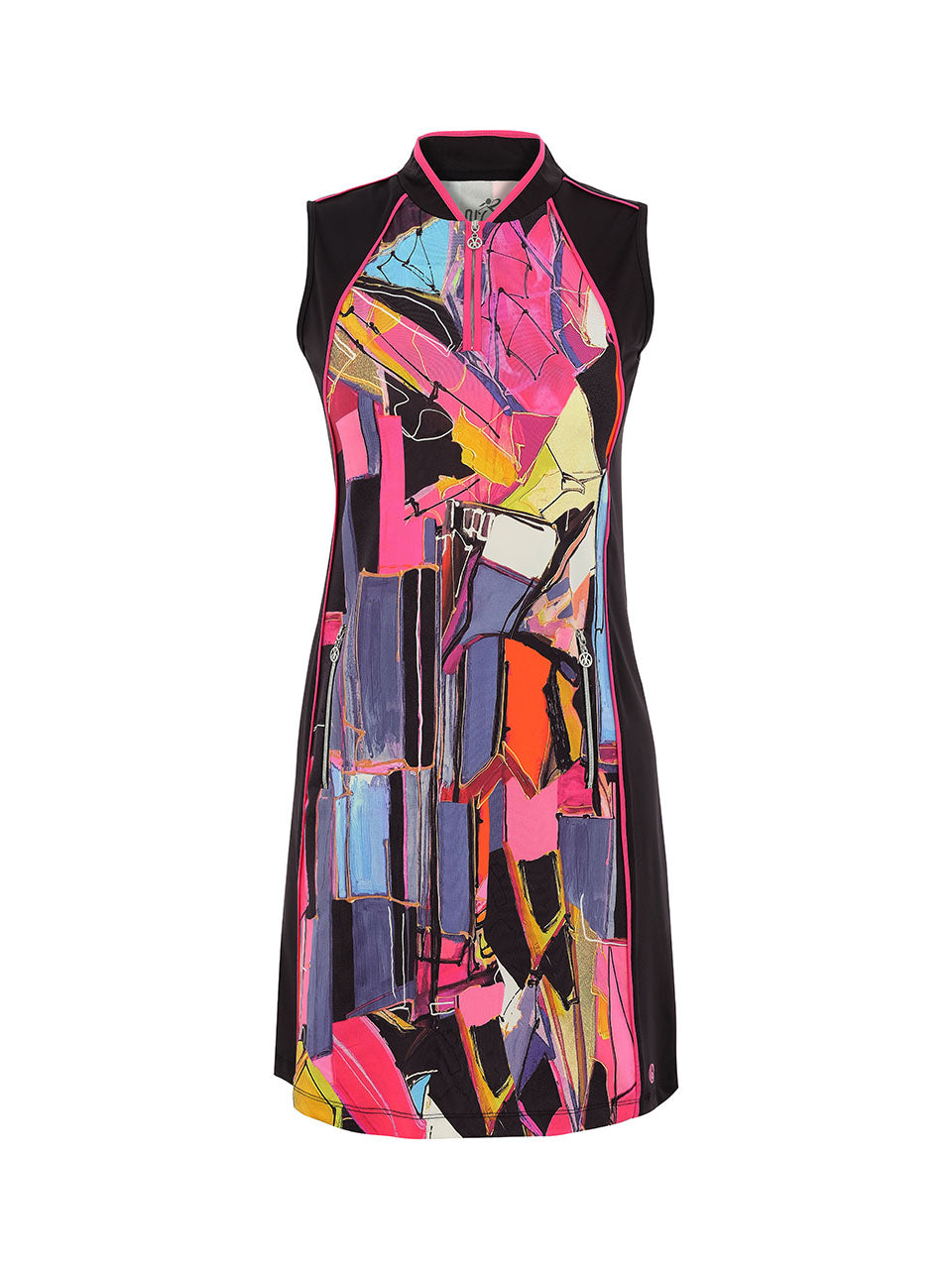 Make a bold statement on the course with this vibrant abstract golf dress. Designed with a sporty zip neckline and sleek sleeveless silhouette, it combines performance comfort with artistic style. The striking mosaic-inspired print adds energy and movement, while the tailored fit allows easy mobility from tee to green. Perfect for sunny rounds or casual resort wear, this dress brings color and confidence to every swing. ⛳️