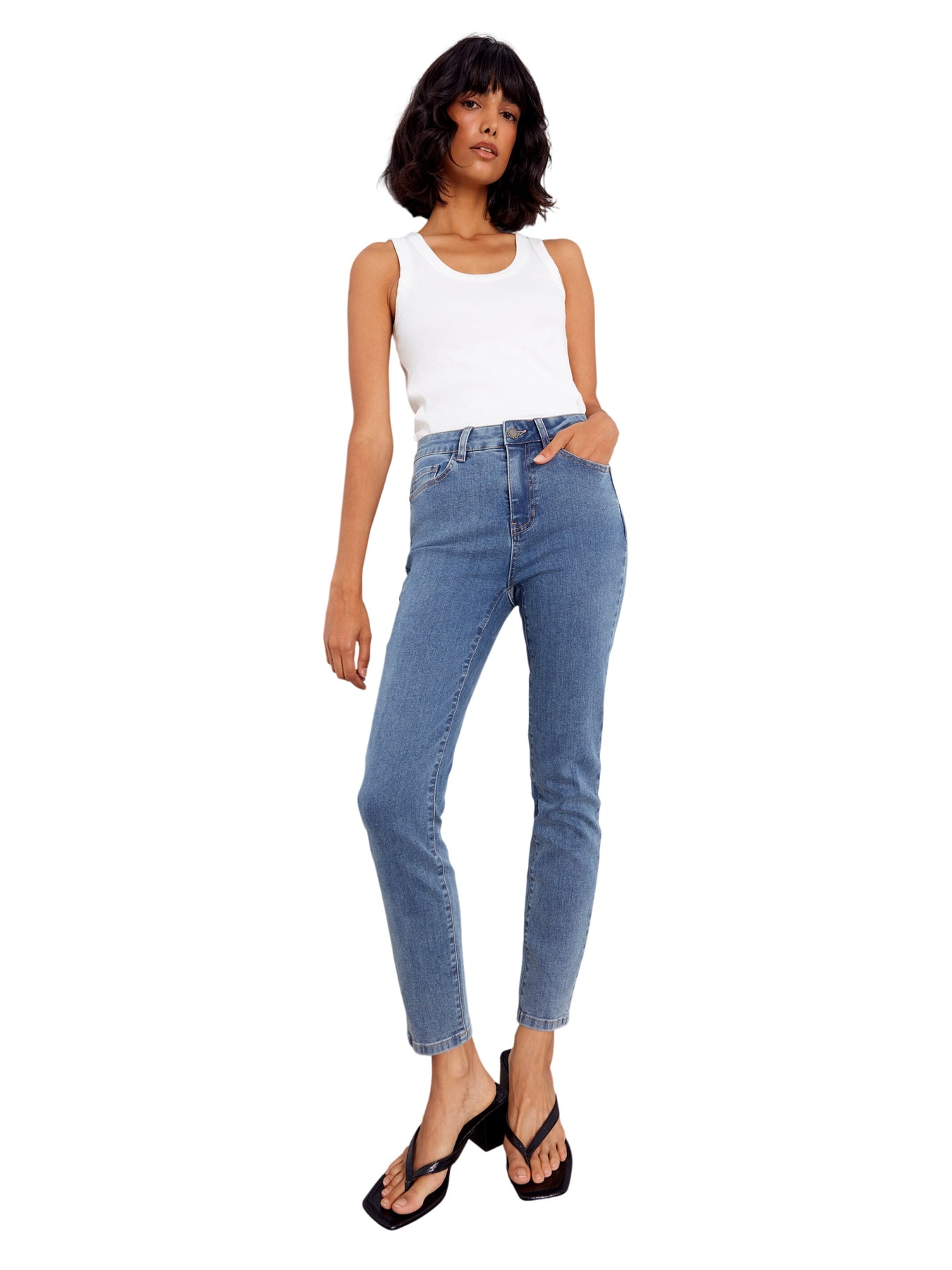 Ce jean slim offre une silhouette élégante qui épouse parfaitement vos courbes. Sa taille mi-haute assure maintien et confort, tandis que sa longueur cheville met en valeur vos chaussures. Confectionné en denim haut de gamme résistant à l'étirement et à la déformation, il est conçu pour vous accompagner dans tous vos mouvements.