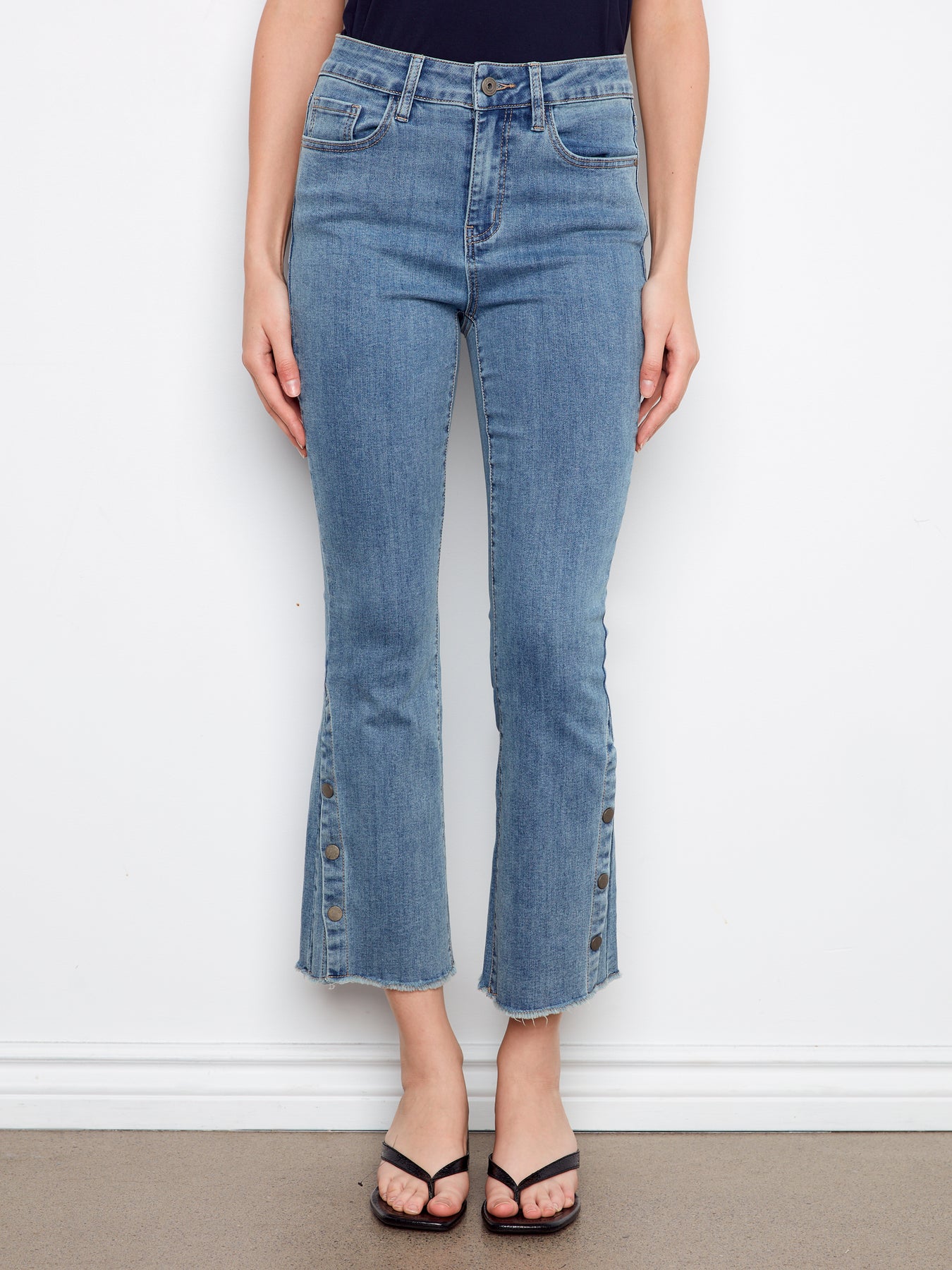 Jean bootcut court à taille mi-haute flatteuse et légèrement évasé. Les boutons-pression sur les côtés ajoutent une touche moderne, tandis que l'ourlet brut lui confère un style décontracté et tendance. Parfait pour un look chic ou décontracté.