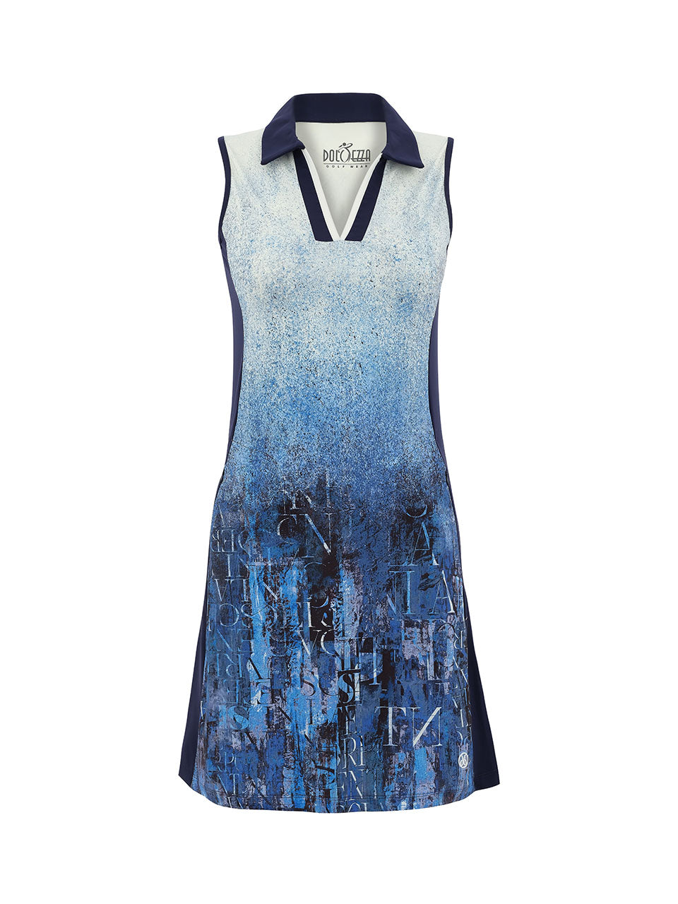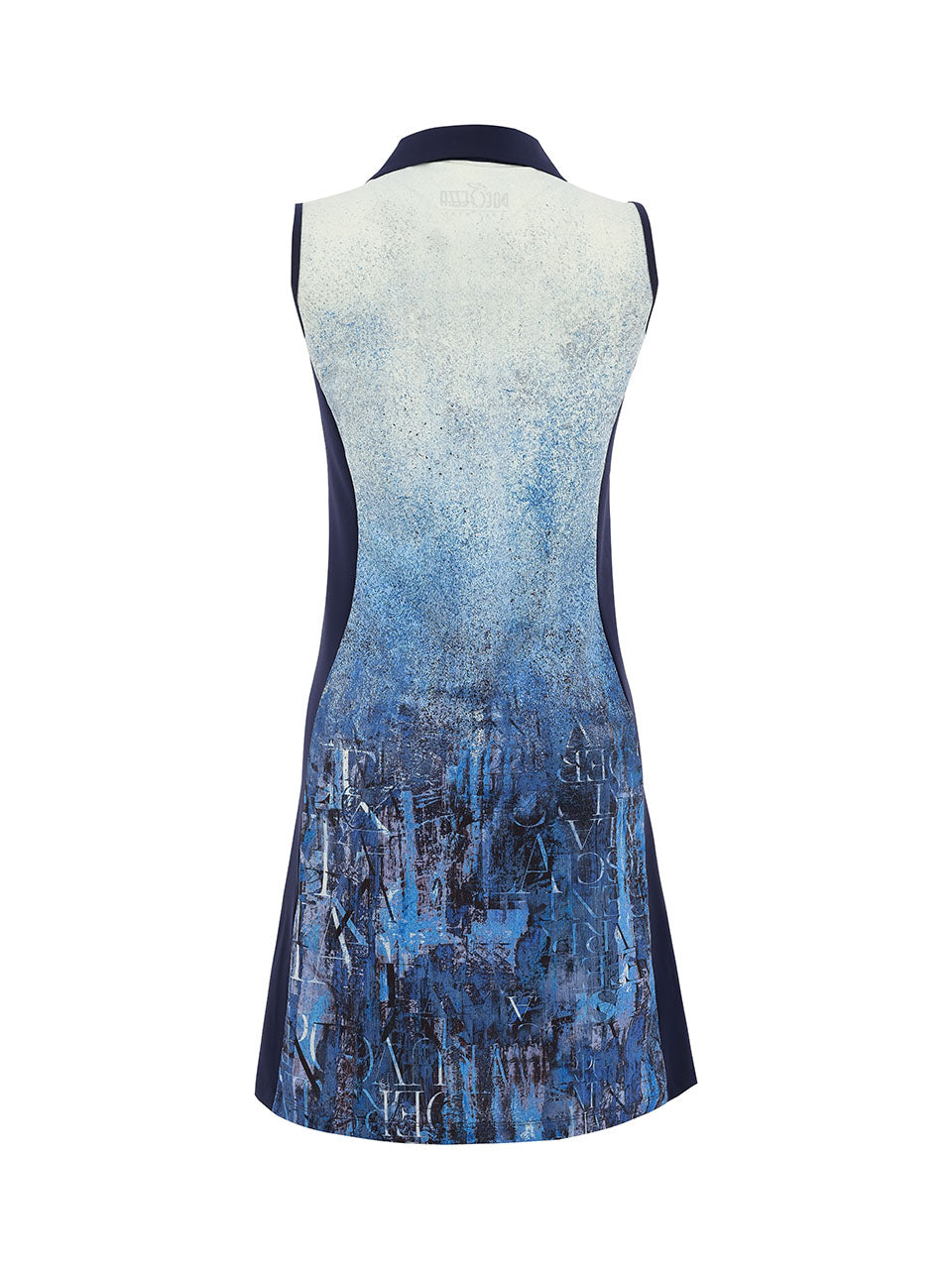 A vibrant sleeveless golf dress featuring a striking abstract mosaic print in refreshing shades of turquoise, aqua, blue, and soft accents of coral and yellow. Designed with a sleek stand collar and sporty half-zip neckline, it offers a flattering silhouette and comfortable stretch for easy movement on the course. Stylish and energetic, this dress blends athletic performance with bold artistic flair for sunny days on the green. ⛳️