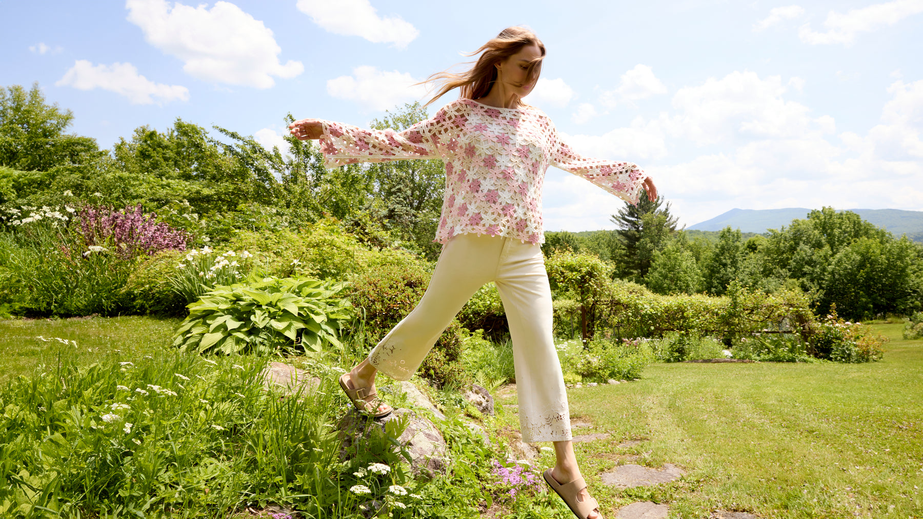 Sheer crochet flower top with an allover floral motif and gently flared sleeves. The lightweight mesh fabric drapes beautifully with a relaxed fit and wide neckline that flatters the shoulders. Layer it over a cami for a bold, textured look that works for both casual days and evening wear.