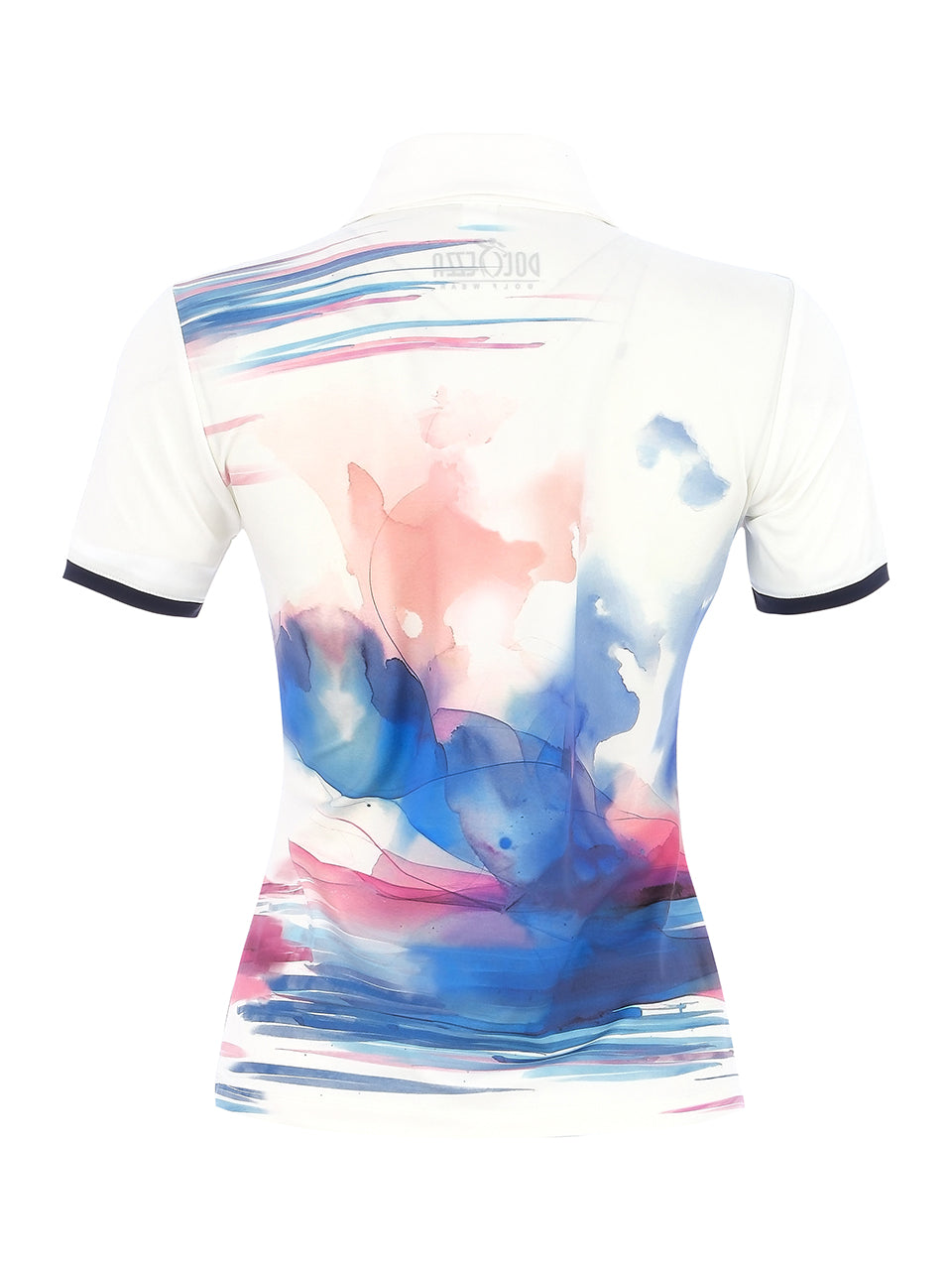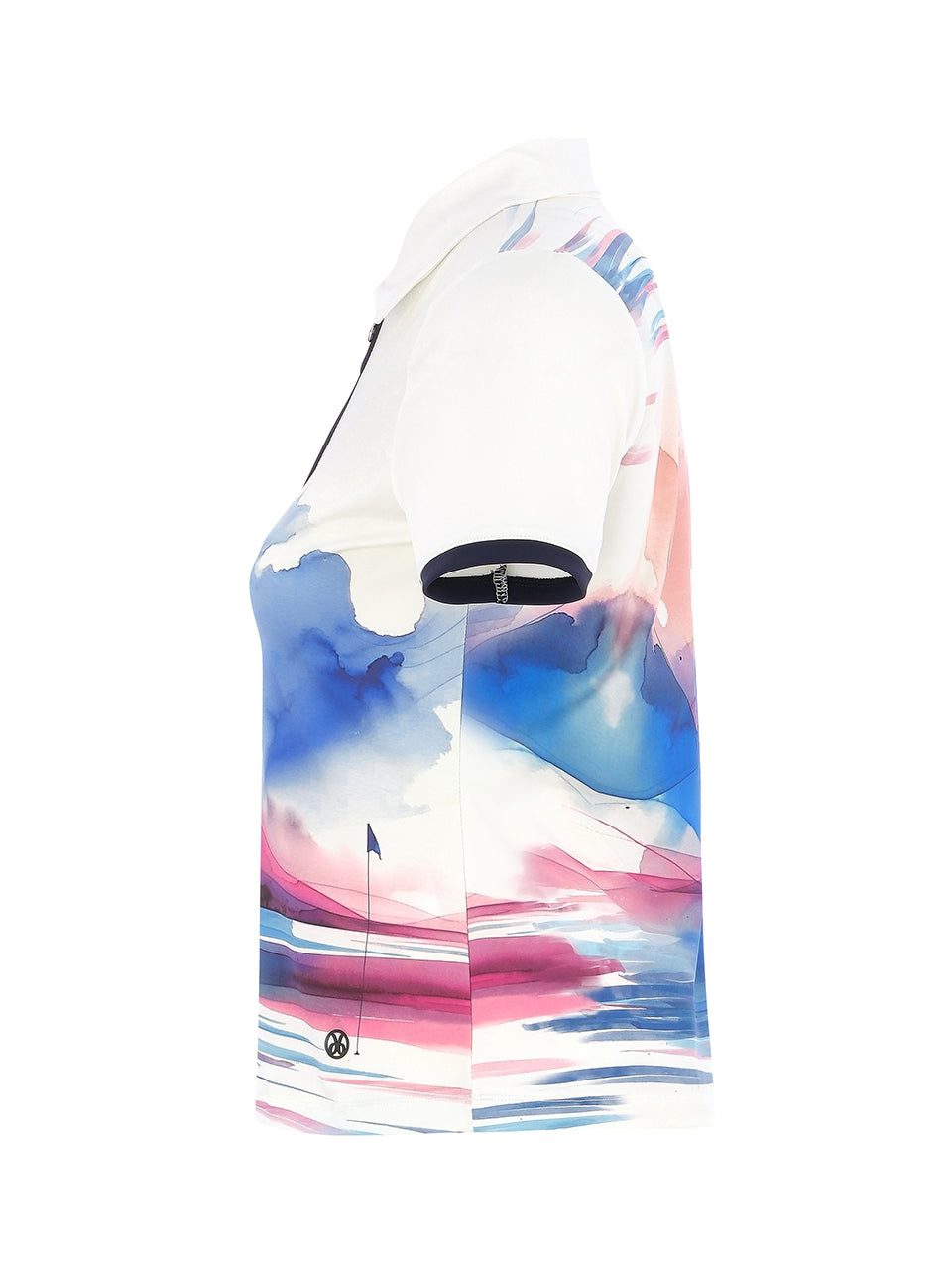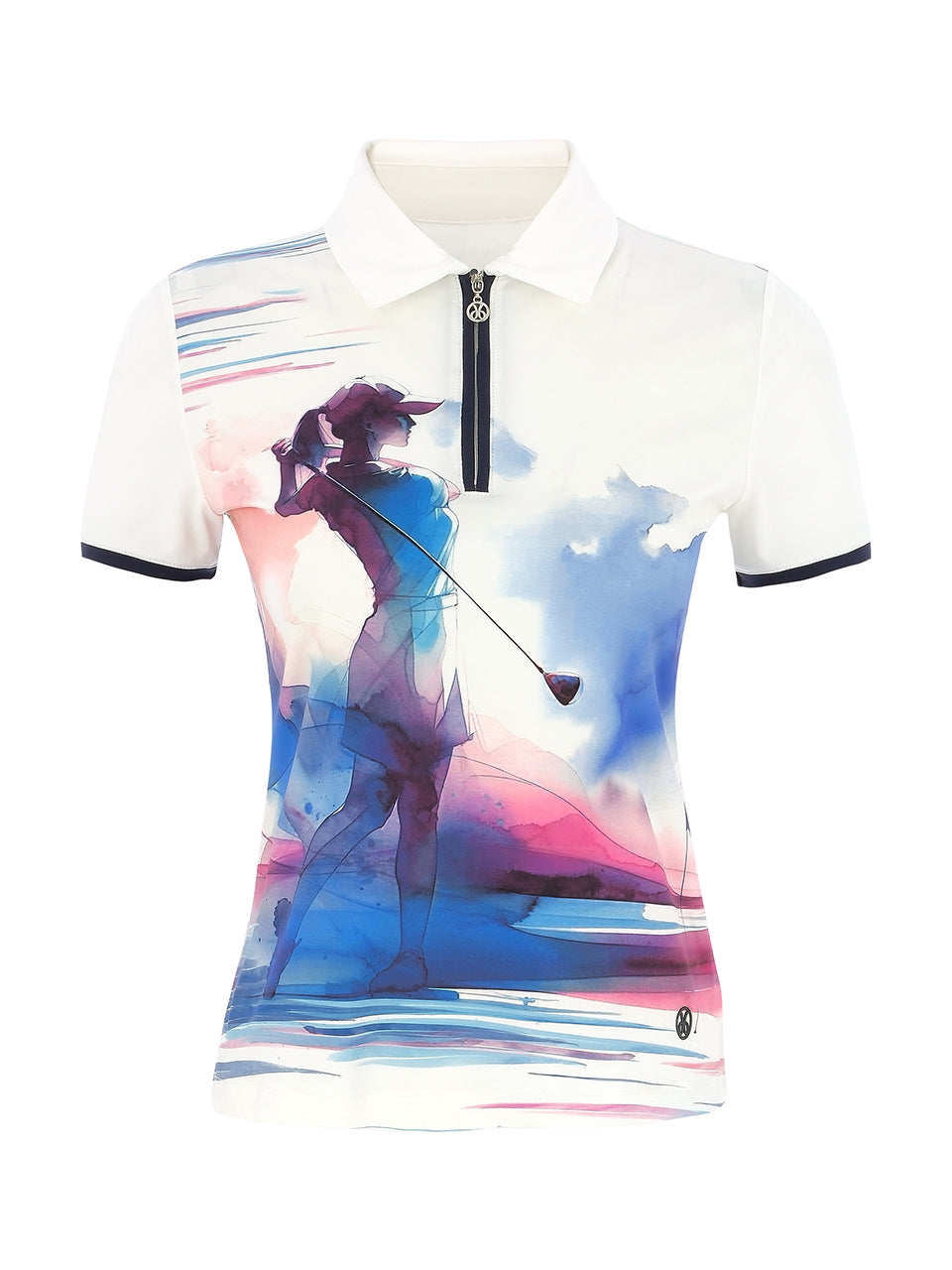 A sporty short-sleeve golf polo featuring an artistic watercolor golfer design across the front. The classic collar with zip neckline adds a polished athletic touch, while the streamlined fit offers comfort and easy movement on the course. Blending performance style with artistic expression, this polo is perfect for golf days, resort wear, or casual outings. ⛳