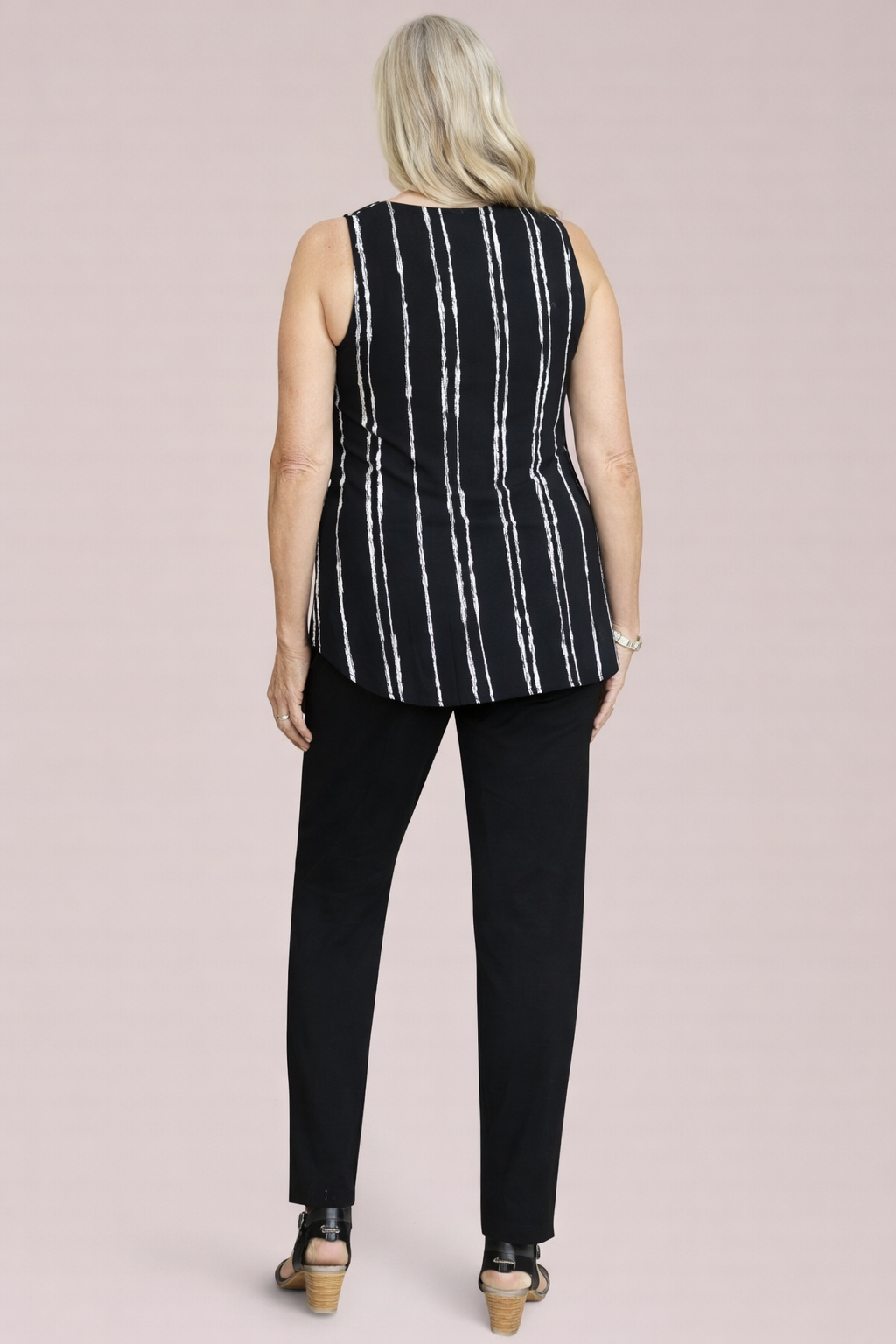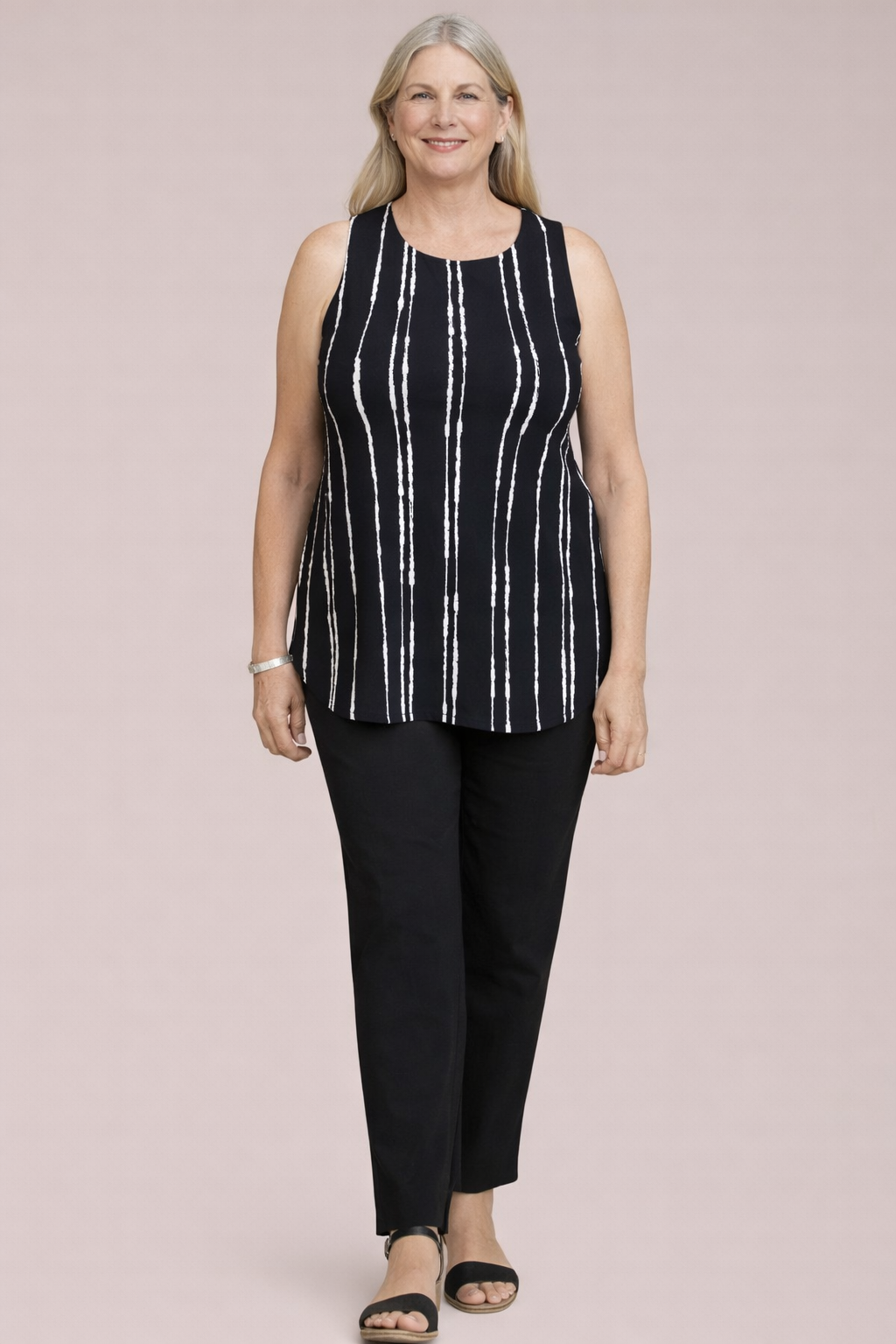 A sleeveless essential that works harder than it looks. This classic tee features a flattering straight cut and round neckline that pairs effortlessly with everything in your closet—from leggings to denim. The vertical print creates a lengthening effect while the lightweight fabric keeps you comfortable all day. Layer it or wear it solo, this versatile piece moves seamlessly from casual to polished.
