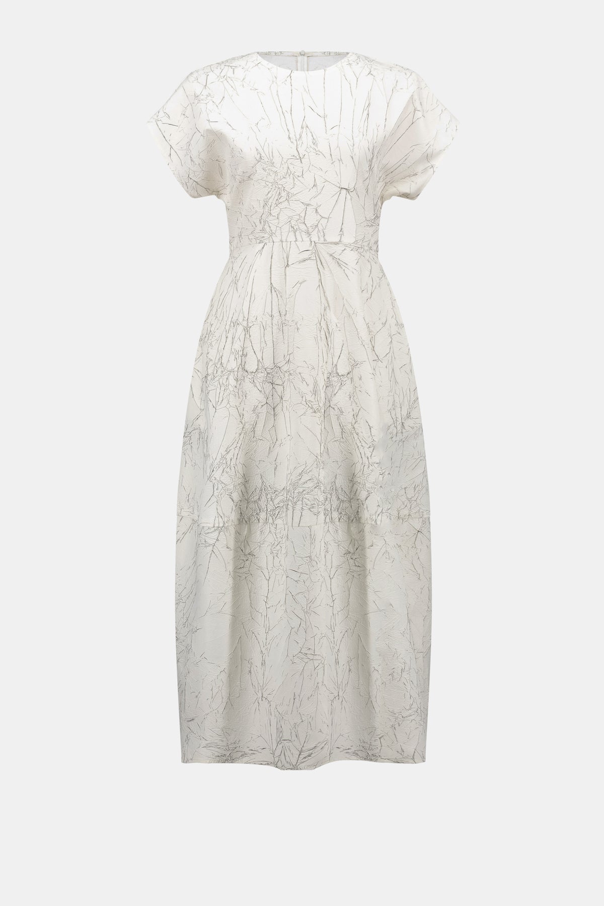 This abstract crinkle novelty cocoon dress flows with an easy, sculptural shape. Designed with a crew neckline and short dolman sleeves, it’s finished with a back zipper and a graceful below-the-knee length.
