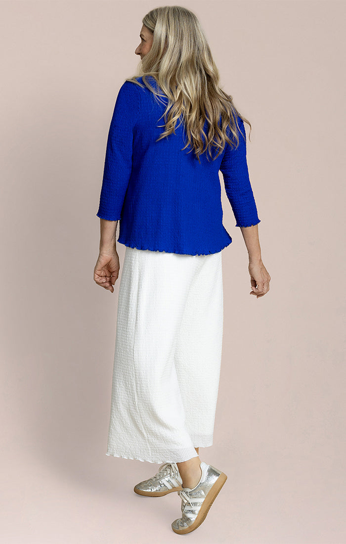 Fresh and effortlessly polished, this relaxed-fit top is designed for easy, everyday elegance. Crafted from a soft, lightweight knit, it features a flattering V-Neck neckline and three-quarter sleeves for versatile wear. The clean silhouette drapes smoothly over the body, while the subtle texture at the hem adds a touch of interest. Perfect for pairing with skirts, trousers, or denim, this top brings a refined yet comfortable feel to any look.