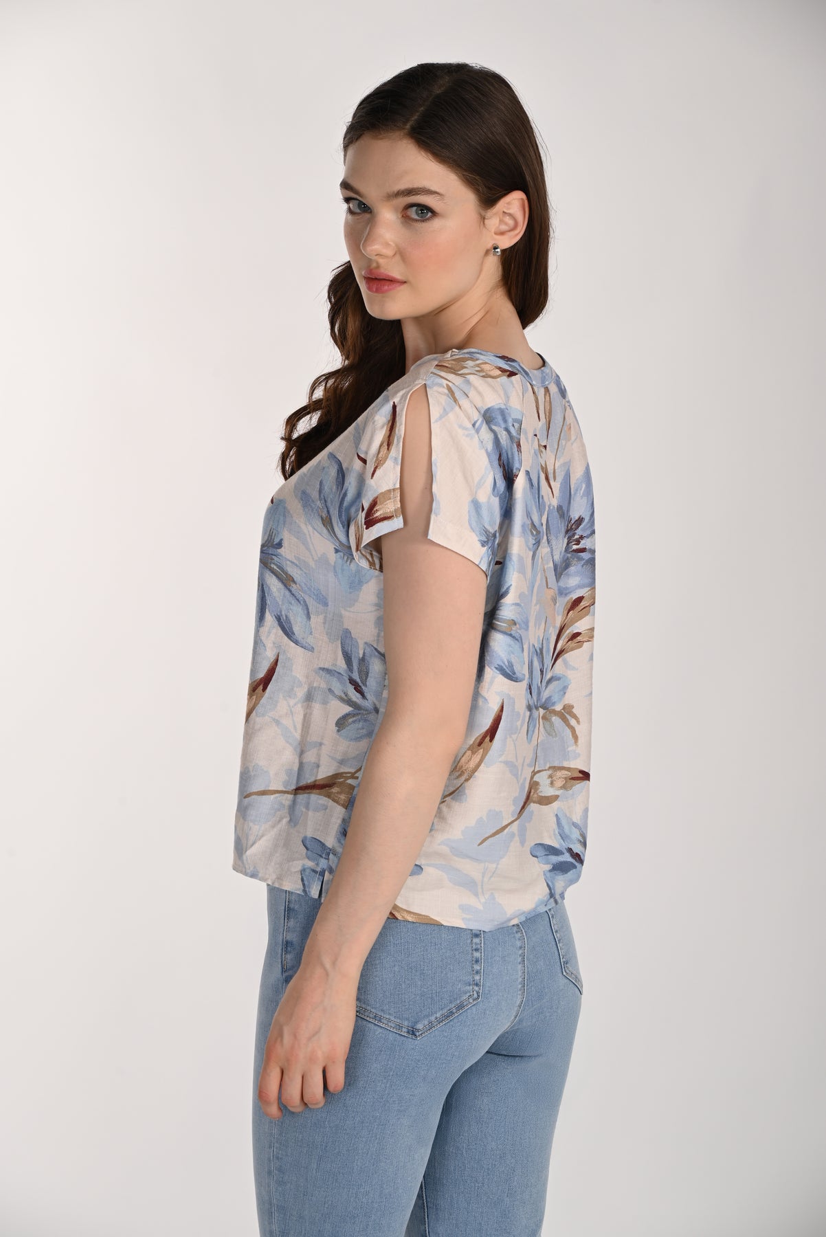 A relaxed everyday essential with a feminine touch, this floral top features a soft silhouette and an easy, airy drape. Designed with a classic round neckline and short sleeves with subtle slit detailing, it offers both comfort and movement. The delicate floral pattern adds a fresh, effortless feel, making it perfect for pairing with denim or casual trousers for a polished yet laid-back look.