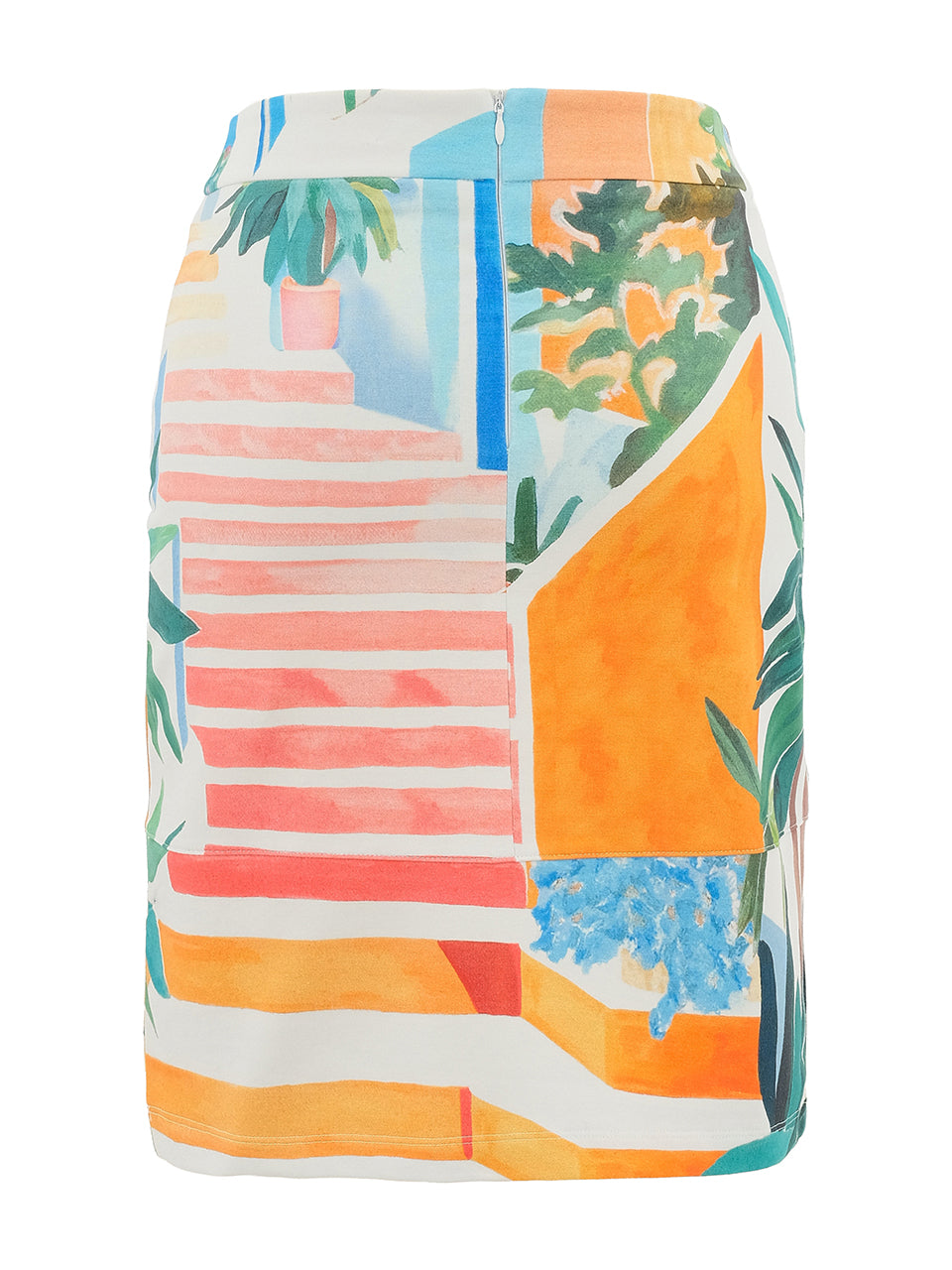This pull-on skirt features an artistic patchwork print inspired by sunlit terraces and coastal scenery. Designed with a clean straight silhouette and a smooth waistband, it offers a polished yet easy fit. The vibrant mix of stripes, botanicals, and color blocks adds a fresh, modern touch—perfect for warm-weather styling from day to evening.